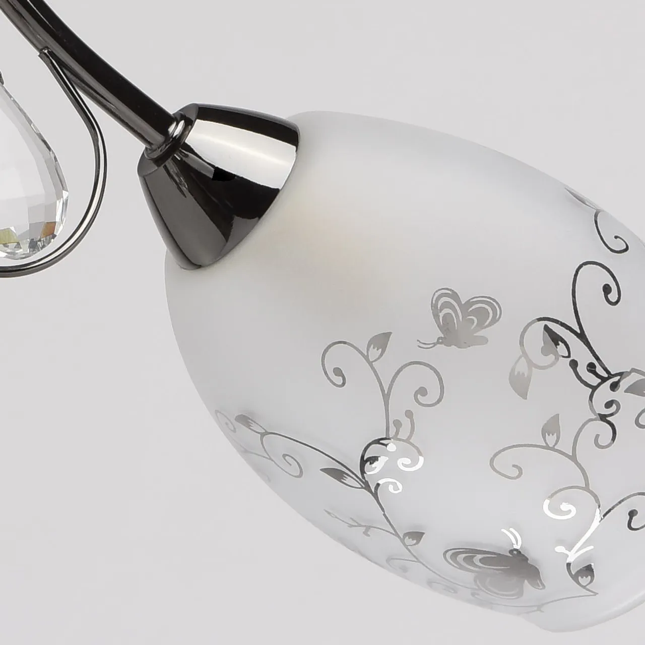 Металлическое основание цвета никеля, плафоны из матового стекла с гальванизированным рисунком, деко